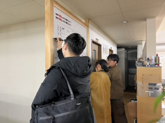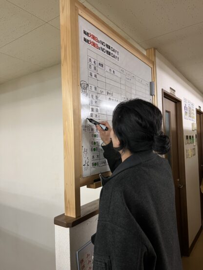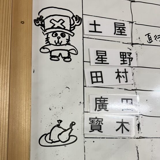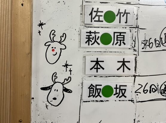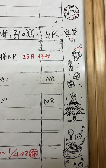 ただただ、25日は出勤日でしたので俗に言う“クリぼっち”は回避できました👍そんな中、若手スタッフがクリスマスを盛り上げようと、皆が行き先を書くホワイトボードに落書きというデコレーションを施しました🎄それがこちら。