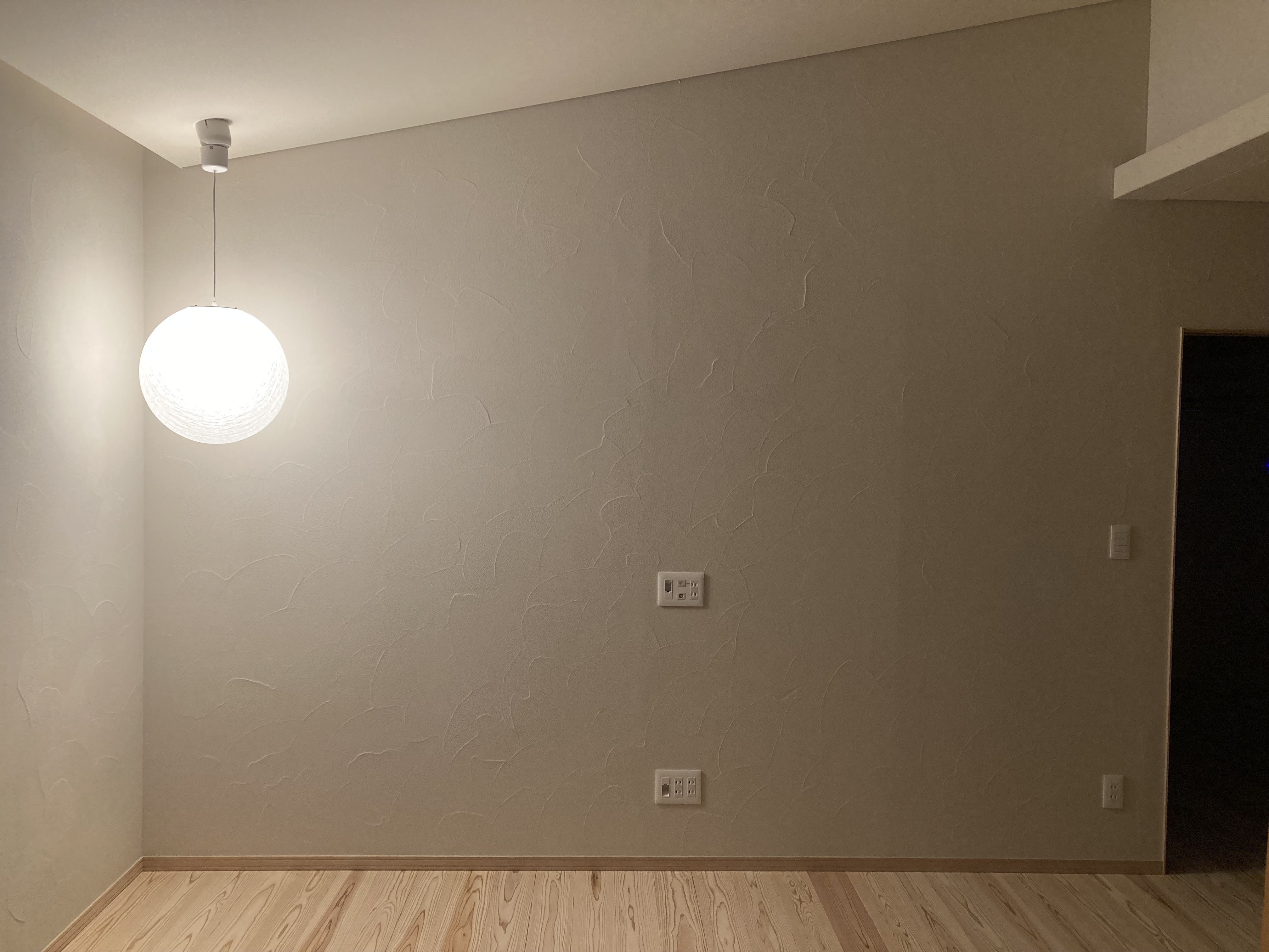 球体のペンダント照明を隅に配置して壁面の余白をとりました。