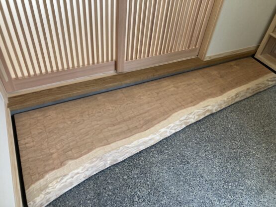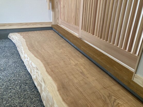 300年の一枚板を使って、キッチンカウンターと敷台をつくらせていただきました。