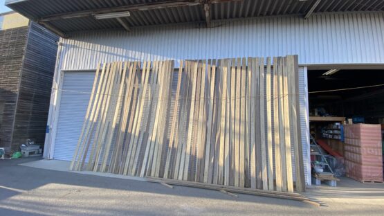 ある日、倉庫に用があり、外に出てふと見上げると杉の羽目板の加圧注入材が立てかけて乾燥れておりました。