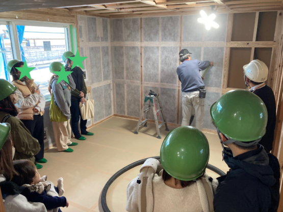 支店長からは、燻煙乾燥のすごさについて。副工場長は、林業試験場で斉藤林業の木が高評価を受けた話を熱弁!そして断熱職人による断熱材の実演では、皆さん前のめりに📏