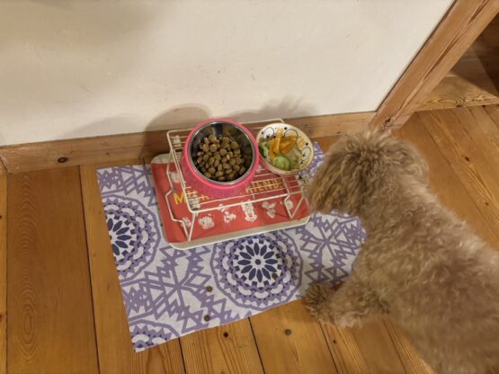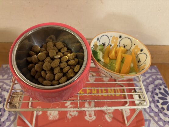 野菜から先に食べて次にドックフードに移ていきます。その前に「お座り」で始まります。