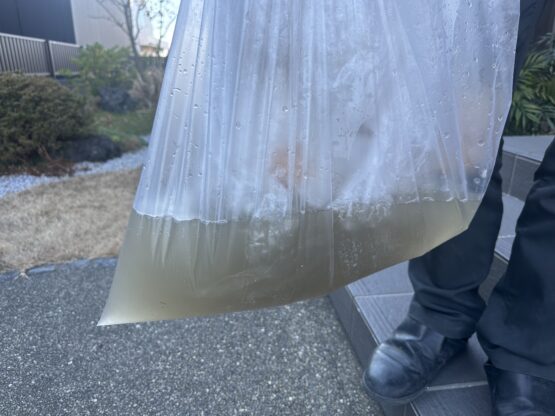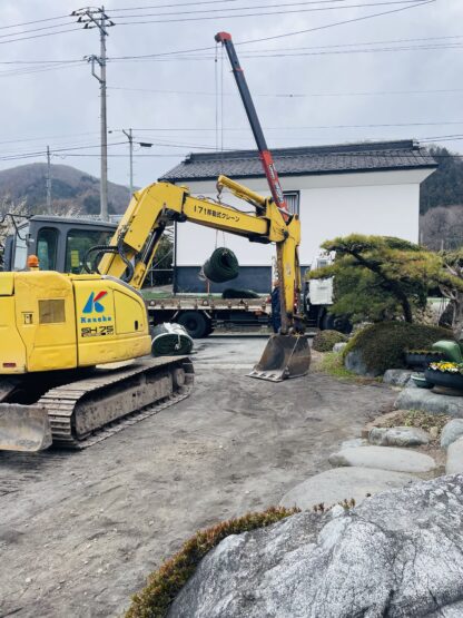 グランドで使用していた人工芝なので分厚く、2m×10mのロール状になっていて、人の手ではびくともしないので重機を使用しました。