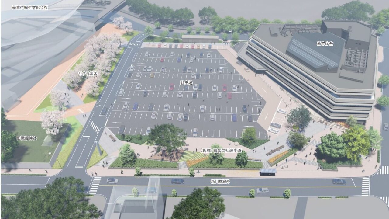 これは工事中も業務継続の旧庁舎を避けた敷地部分で計画したからです。