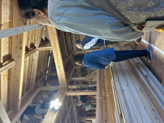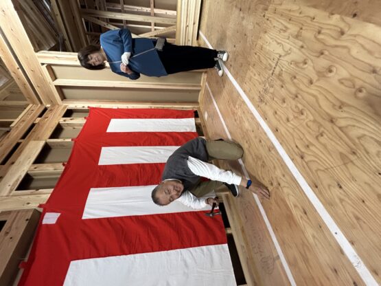 お住まいづくりの想いをご記入いただいた棟札を棟梁に託して、棟木に取り付けます。