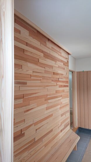 玄関を入ると、まず目に飛び込んでくるのは無垢の木で仕上げた壁。