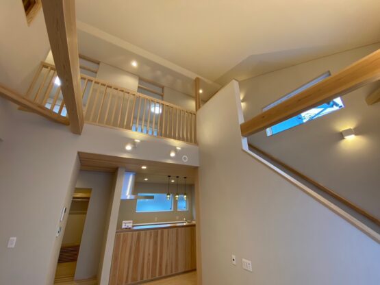 K様邸はリビング階段から二階の廊下に繋がる造りで、廊下部分は格子手摺となっています。私、吹き抜けに面した格子手摺がとても好きなんです。一気に軽やかな感じになりますよね。
