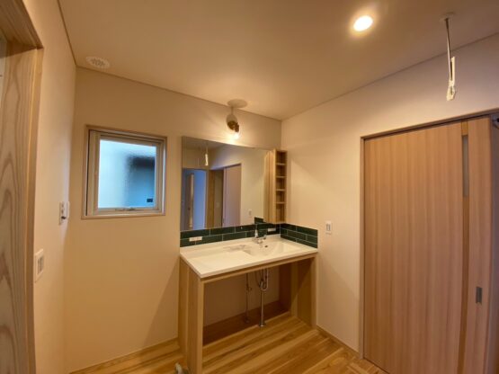 そして造作の洗面、ちょっと引きで撮ってしまいましたが、アイカ工業さんの天板に木製の脚、水返しタイルを貼って、大きな鏡の横にはちょっとした収納。