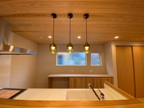 キッチンの手元灯は三連の硝子ペンダント、こちらもかわいいですね。カフェみたいな雰囲気です。