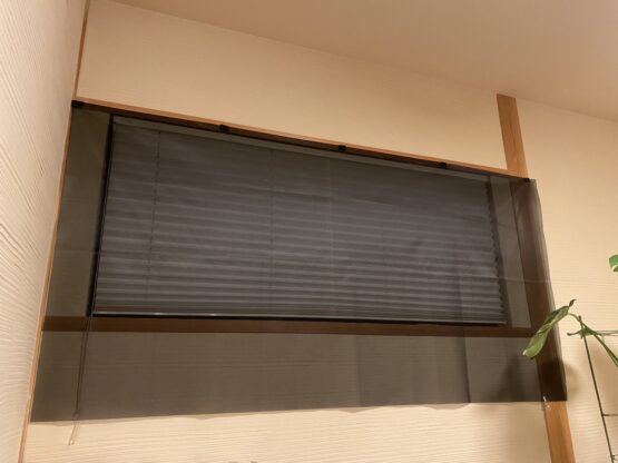 外からの熱を抑えるためにブラックのネットを窓に設置。