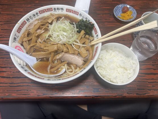 自分はメンマチャーシューラーメン大盛り+ライスを注文