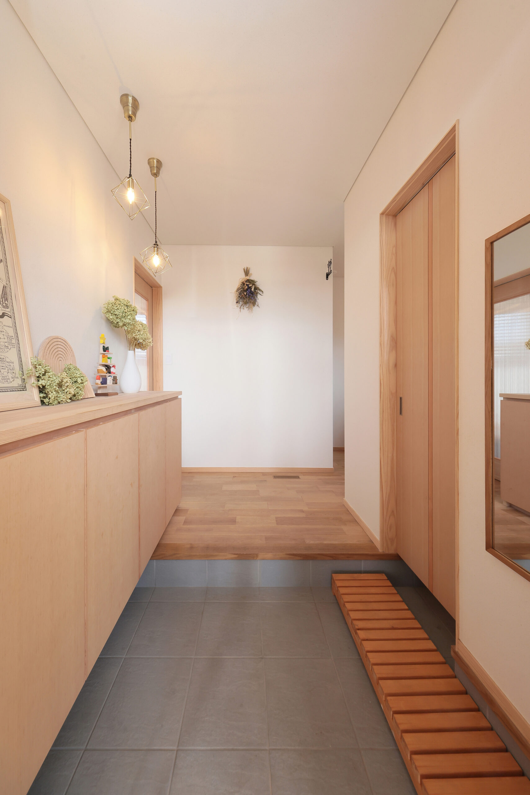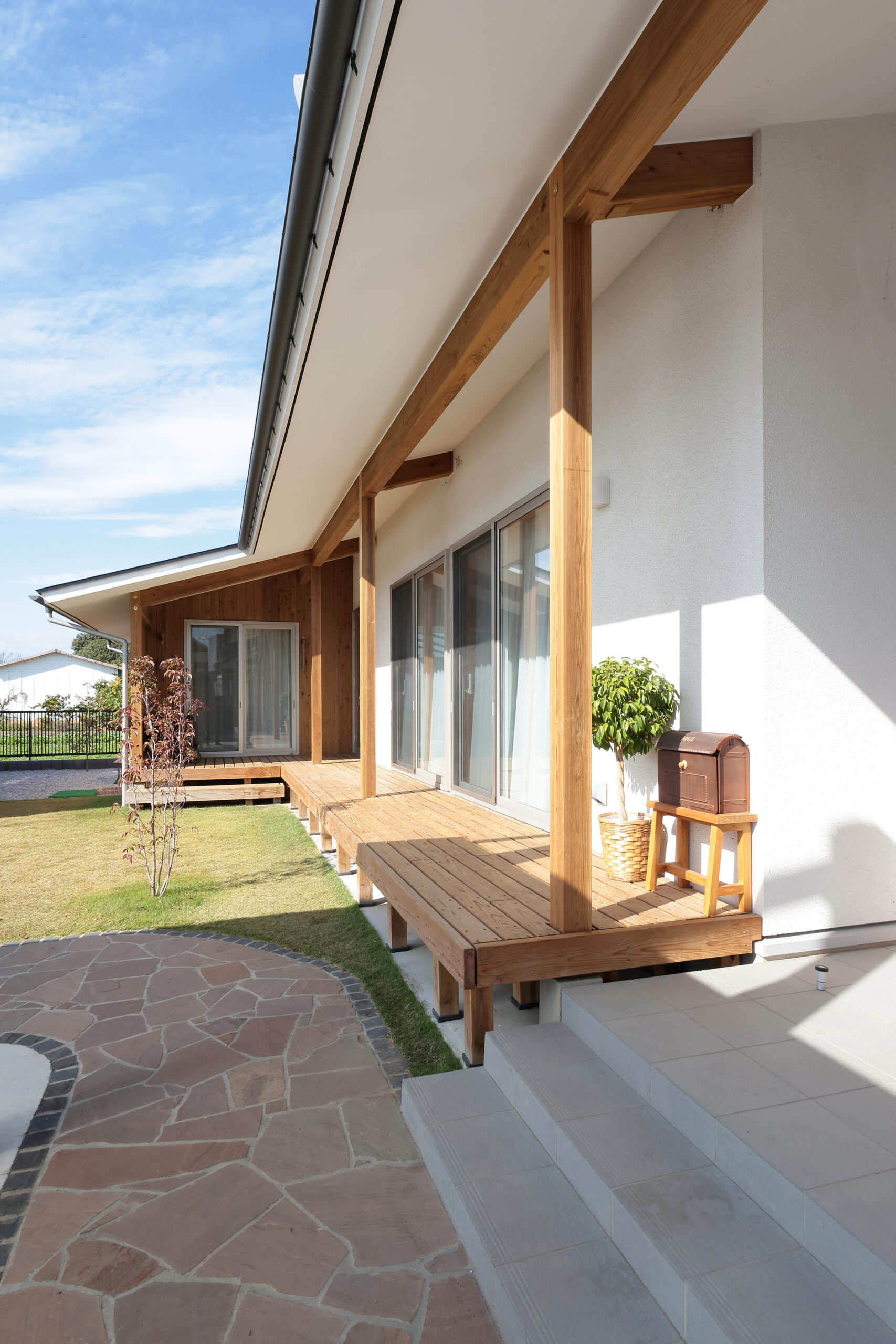 板張りや格子により内外観ともに木の風合いを感じられる斉藤林業らしいお住いが完成しました。