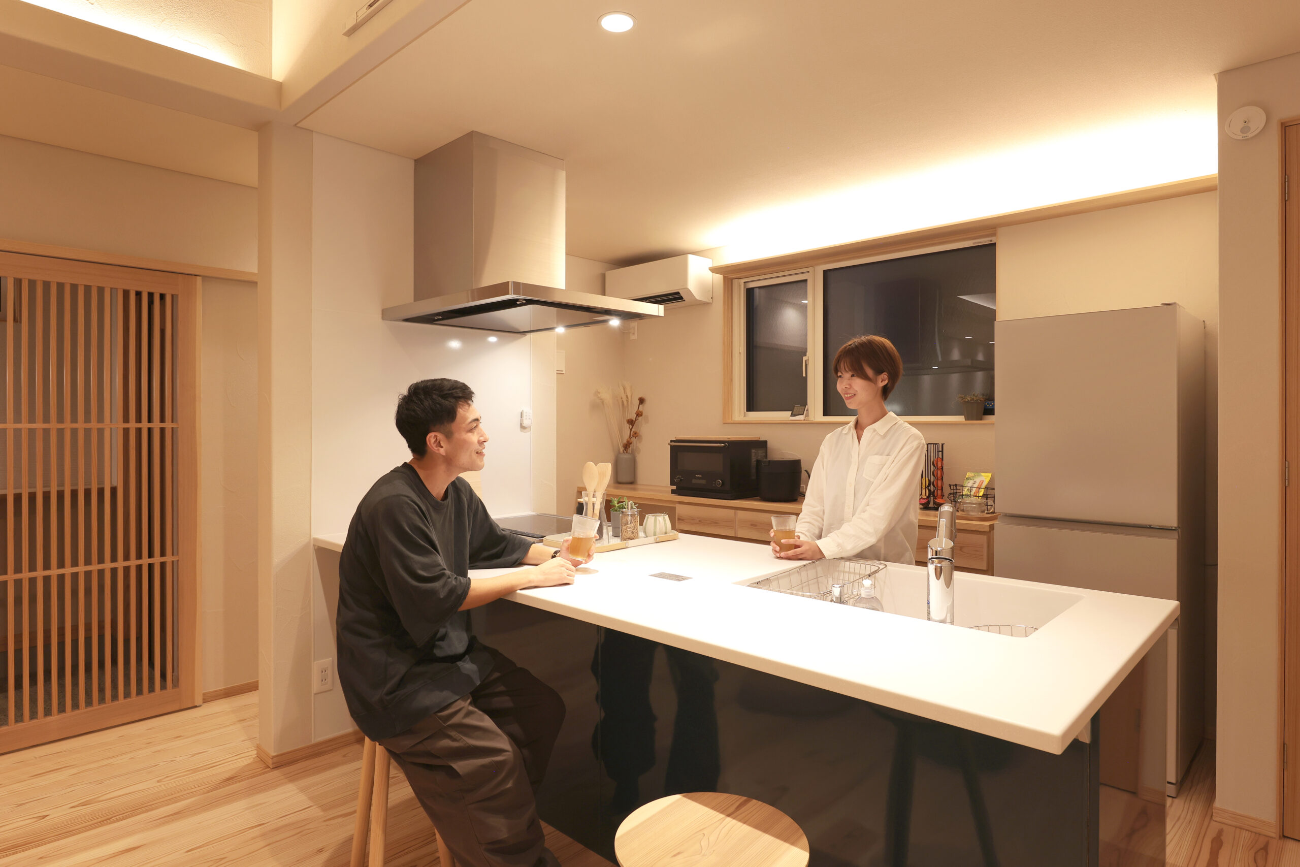木のぬくもりについては、頭ではわかっているつもりでしたが、実際に一晩過ごしてみると改めてその心地良さを体感できました 。まず家に入ってすぐ感じたのが、床下エアコンのちょうど良さです。家全体にほんのりと残りつづけるあたたかさがすごく良かったです 。リビングの扉はガラス製ですが、冷気を感じることが全くなく、断熱性能の高さを肌で知ることができました 。