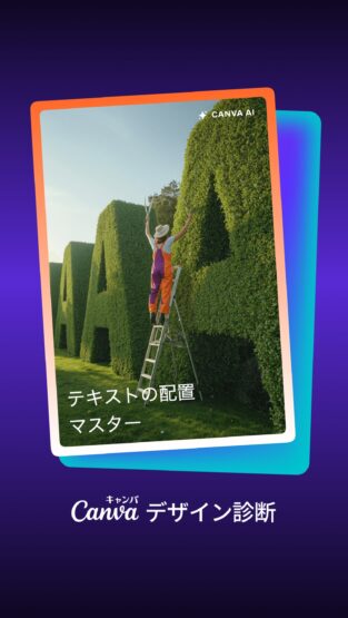 診断画面には植栽を丁寧に整えているようなビジュアルが使われていて、「テキストの配置マスター」というタイトルも添えられており、思わずクスッとする仕上がりでした。