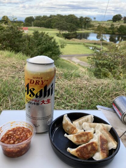 キャンプ場全体を見渡しながら、「どこにテント張ろうかなぁ?」とスマホ片手に情報収集しながら啜ります。