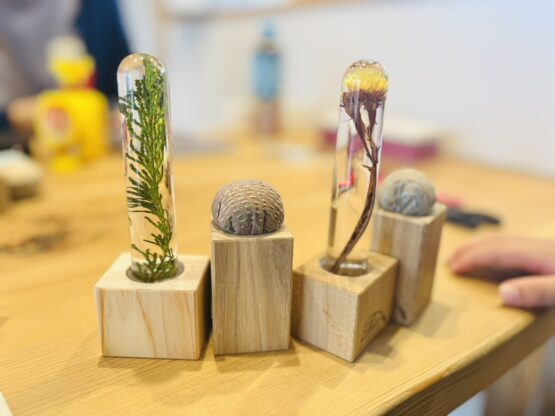 ハーバリウムづくりでは、高山村の健気な美しさの野草を、そっとガラスのチューブに閉じ込める作業に夢中になっていらっしゃいました 。土台となる無垢の木は、斉藤林業オリジナル!木の種類の違いによる色合いや風合いを楽しみながら、お好きなものを選んでいただきました 。