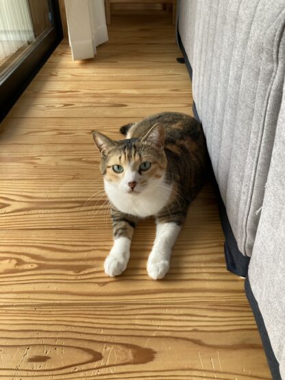 ご家族の一員である「こむぎちゃん」は、前のお住まいのときから私が訪ねると、いつも恥ずかしそうに物陰に隠れてしまっていたのですが…