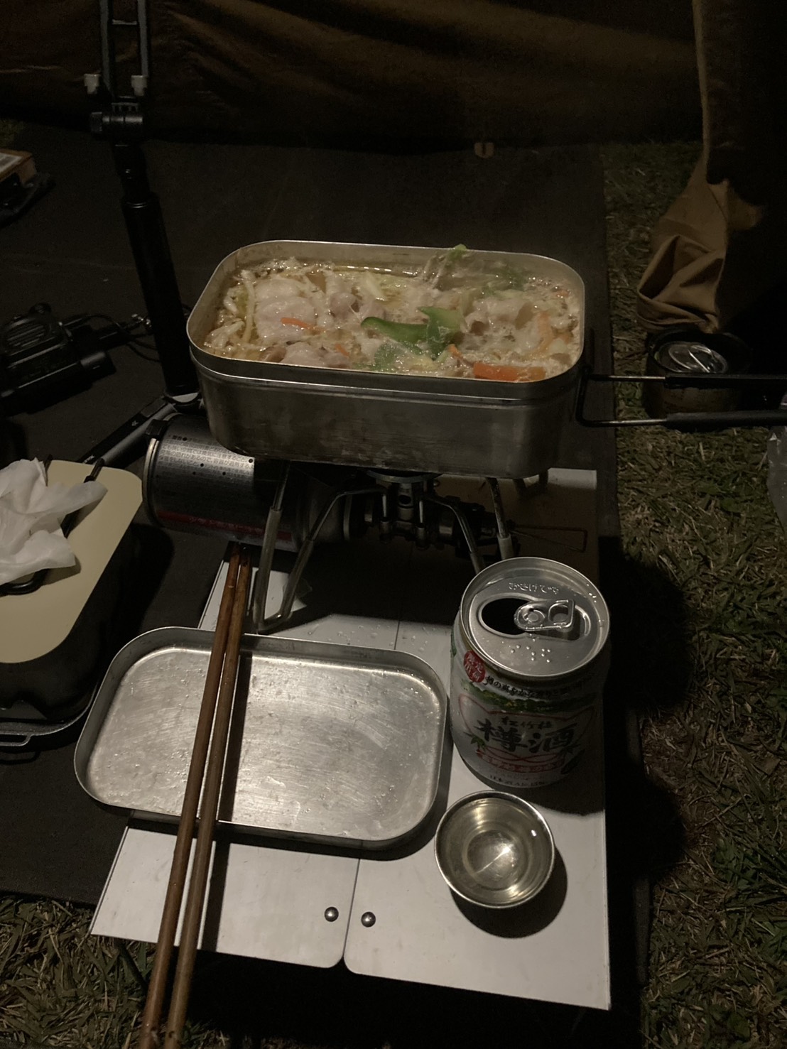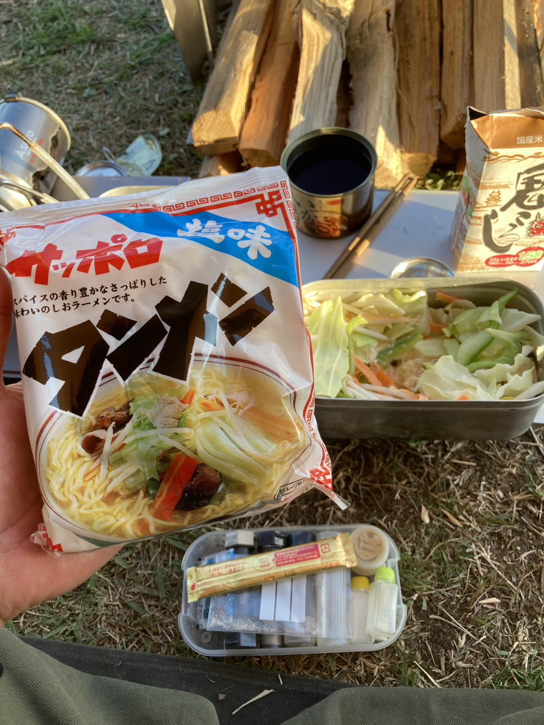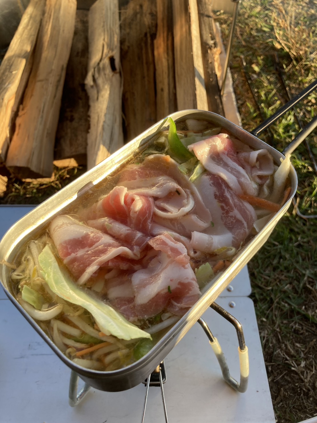 持参したごま油と鶏がらスープの素と酒を加え、具はカット野菜と豚バラ肉。