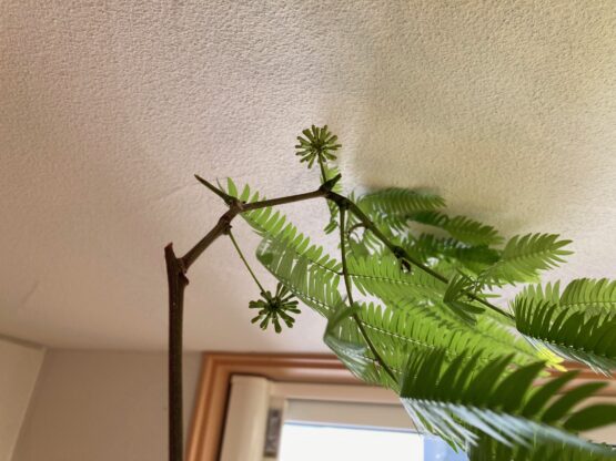 年末の「みやこの家」展示場で観葉植物「エバーフレッシュ」に小さいものが垂れ下がっているのに気づきました🌿