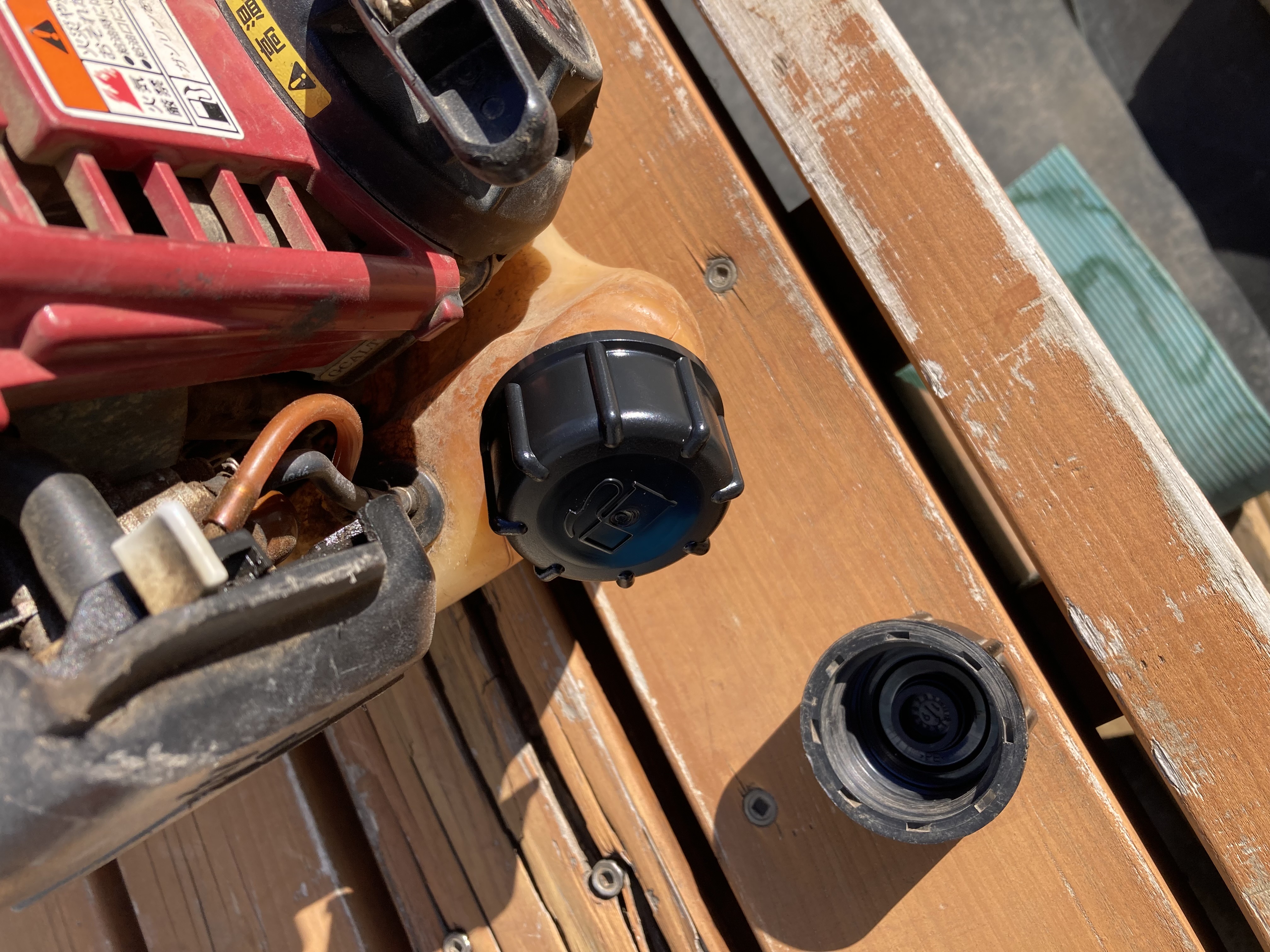 これは簡単、新しい燃料キャップを農機具店で買って交換。