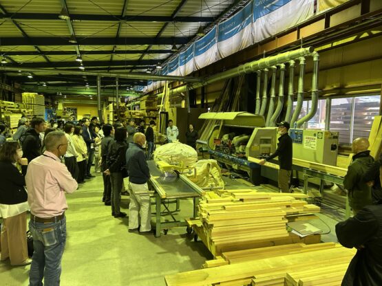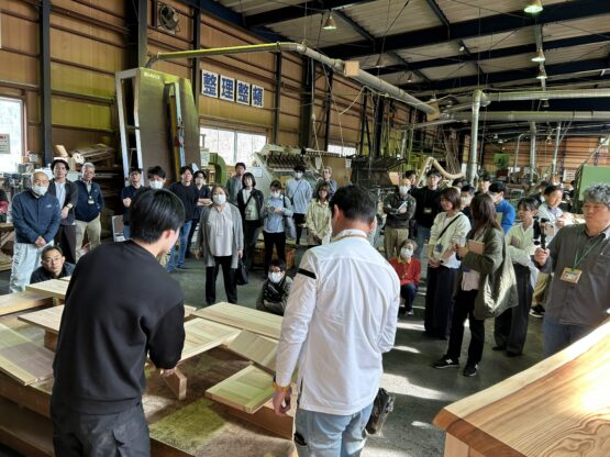 • 0.1mmを追求する家具工房: 本社工場での研修では、木目を合わせる「気取り」や、他社が用いるビスケットよりも強固な「ドミノ」を用いた接合技術を確認しました。さらに、職人は「ビシャビシャ(滴るほど濡れた)」の布で木を拭き、あえて毛羽立ちを起こさせてから磨き上げる実験を行い、0.1mm単位の精度を肌で学びます。お客様の「〜したい」を形にする拠点が、自社にあることの強みを再確認しました。