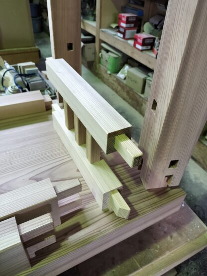 脚のデザインはお任せいただいたので、真壁作り・欄間のある設計の和風の雰囲気に合わせて直線基調と縦格子を取り入れて作りました。
