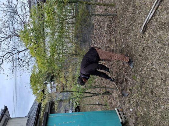 根が付き安定するまでの間 風の影響を受けぬように固定して作業は終了しました。